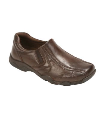 Give him a classic and cute style with the Travis slip-ons from Deer Stags. Faux leather upper in a casual slip-on style with a round toe Elastic twin gored panelsfor a personalized fit Padded collar Textile lining cushioning insole Traction outsole